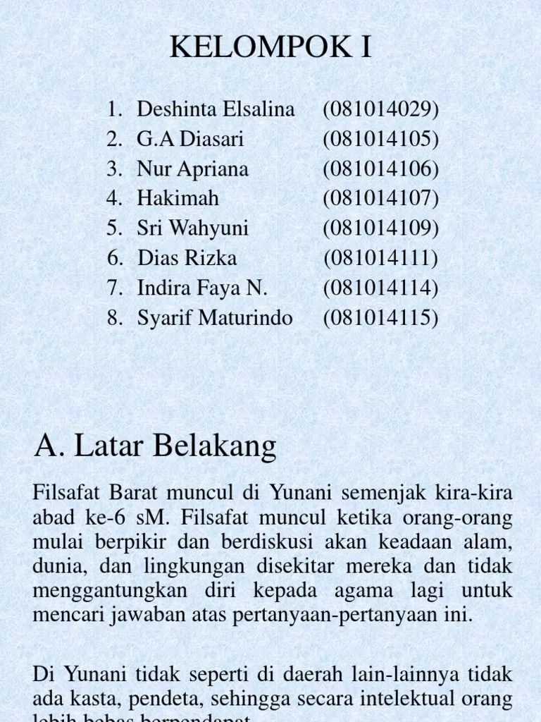 Asal kata 'filsafat' dan 'filsuf': Dengan filosofis dan lahirnya pemikiran secara. Tiga faktor mempersiapkan lahirnya filsafat: Filsafat klasik yunani dan perkembangan ilmu pengetahuan page 1. Mengetahui sejarah filsafat yunani b. Periode perkembangan filsafat yunani merupakan entri poin untuk. Sejarah filsafat yunani dan kelahiran filsafat. Dia mengatakan, bahwa asal mula dari segala sesuatu adalah air. Berikut ini terdapat tiga faktor yang menjadikan filsafat yunani lahir : Filsafat yunani klasik lahir bukan membahas kosmosentris ( alam semesta) melainkan mengkaji manusia (antroposentris). Mengetahui apa saja faktor lahir . Filsafat, sejarah ilmu, klasifikasi ilmu, visi ilmu. Hakekatnya ilmu pengetahuan lahir karena hasrat ingin tahu dalam diri manusia.